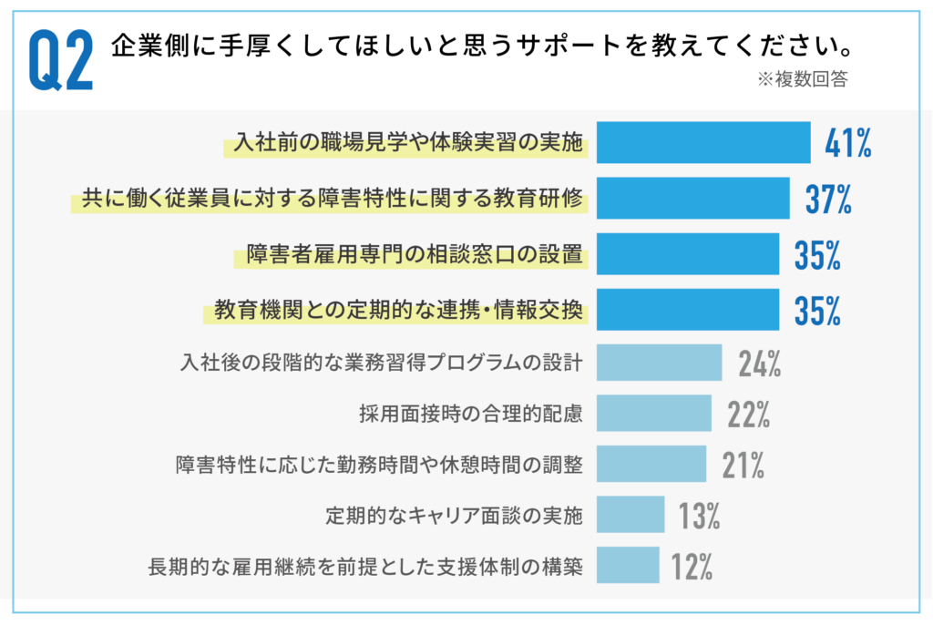 企業側に手厚くして欲しいと思うサポートについては、「入社前の職場見学や体験実習の実施」が41%で最多。次いで「共に働く従業員に対する障害特性に関する教育研修」が37%、「障害者雇用専門の相談窓口の設置」と「教育機関との定期的な連携・情報交換」が35%となっている。
