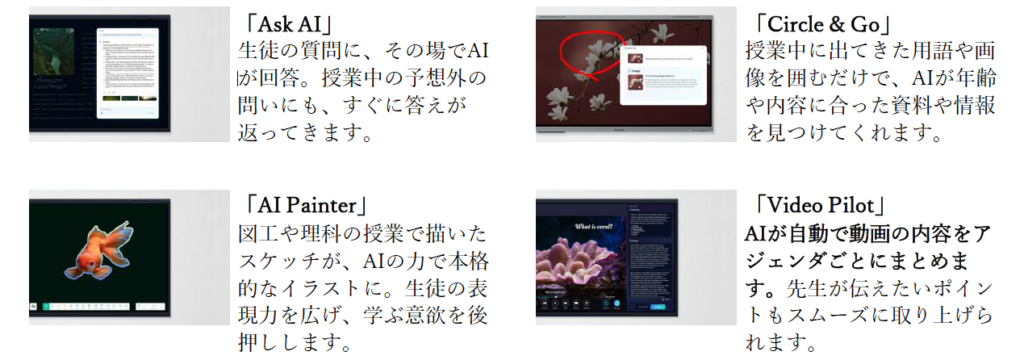 また、Google EDLA認証を取得したAndroid OSが搭載し、教育現場で活用されているGoogleの機能(Google ClassroomやGoogle Drive等)を活用できる。さらに、本商品には、教科・学年・カリキュラムに対応した「教育専用AI」が標準搭載。本AIは、現場の教材や指導法に合わせて継続的にアップデートされ、世界75,000教室以上で日常的に使用されているという。