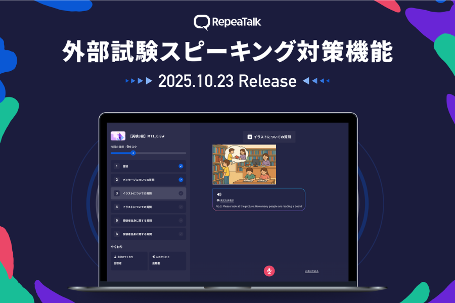 大学入試における外部検定利用が拡大するなか、学校現場ではスピーキング指導が大きな負担となっている。本機能は、そうした課題の解消を目的に開発された。教員の指導時間を圧迫する「スピーキング面接練習」をAIが代替することで、教育現場全体の効率化と学習機会の平準化を目指す。