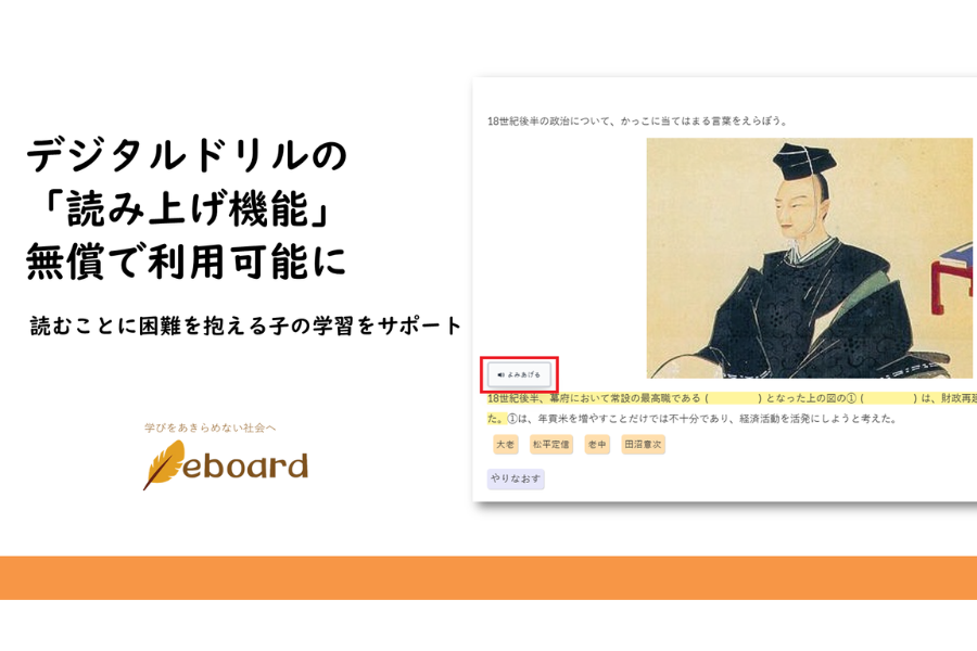 NPO法人eboardは11月5日、ICT教材「eboard」のデジタルドリルに新機能「読み上げ機能」を追加した。本機能は、読むことに困難や苦手意識がある子が安心して学びを進められるようサポートする機能。公立学校・非営利活動、家庭での利用(個人)に無料で提供している「eboard」のアカウントでログインすることで利用できる。