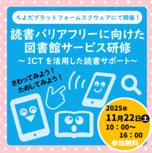 読書バリアフリー法(視覚障害者等の読書環境の整備の推進に関する法律)は誰もが読書ができる社会の実現を目指した法律となる。(公財)文字・活字文化推進機構は多様な利用者のニーズに応じた「図書館サービス」を行うためには、どんなことが必要かを紹介するため実践を交えた研修として、「読書バリアフリーに向けた図書館サービス研修~ICTを活用した読書サポート~」を11月22日(土)、東京・千代田区のちよだプラットフォームスクウェアで開催する。申込締切は11月12日(水)正午まで。