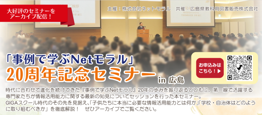 広島県教科用図書販売は、9月13日に開催した「事例で学ぶNetモラル」リリース20周年記念セミナーのアーカイブ動画を配信している。