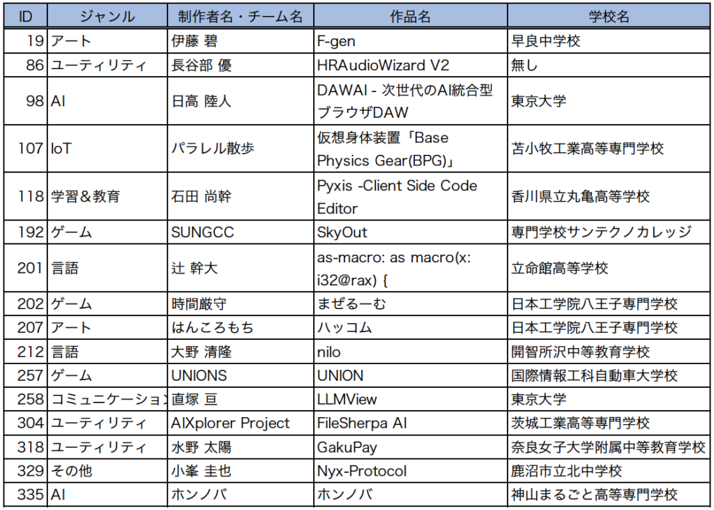 U-22プログラミング・コンテスト実行委員会は、一次審査を実施し、最終審査に進む16作品を決定した。最終選考には、中学生が4作品も選出され、若年層の作品が高く評価されたほか、AI、IoT、アート、言語など幅広い作品が選出された。