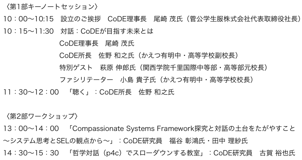 CoDEは、少子化が進行する日本社会において、教育を未来への最重要投資と捉え、その質の向上を目指し設立する。国内外の教育機関や企業、行政、地域との連携を促進し、「これからの教育はどうあるべきか」を共に問い、考える“共創”のプラットフォームとなることを目指している。
