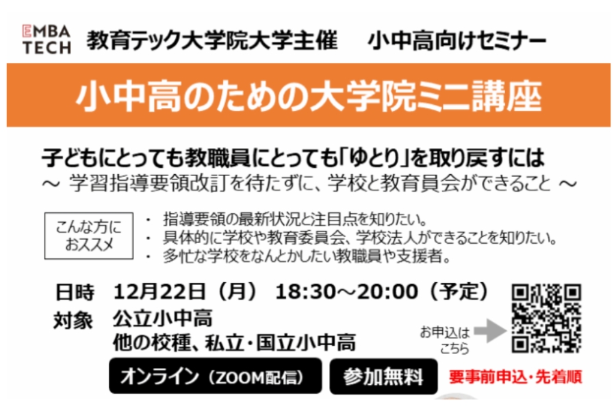 教育テック大学院大学は12月22日に、小中高のための大学院ミニ講座として「子どもにとっても教職員にとっても「ゆとり」を取り戻すには~学習指導要領改訂を待たずに、学校と教育員会ができること~」をオンラインで開催する。