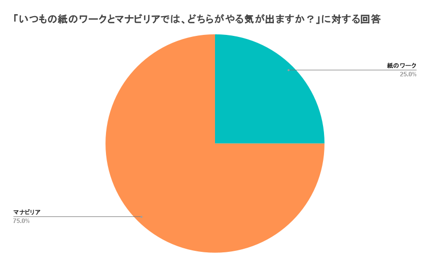 「いつもの紙のワークとマナビリアでは、どちらがやる気が出ますか?」という質問に対し、約70%の生徒が「マナビリア」と回答。生徒からは「何回も繰り返すことができる」「自動的に丸付けがされるところ」「解説がついているところ」など、デジタルならではの利便性がモチベーションにつながったという声が寄せられた。