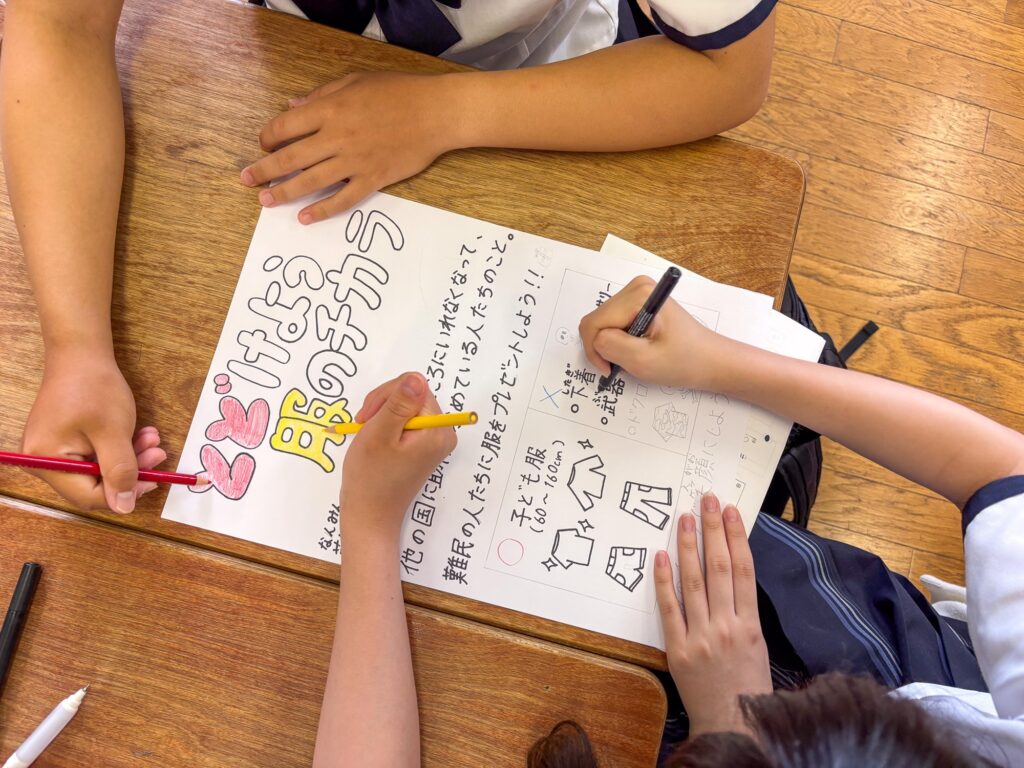 「信愛中高人権デー」を経て、1年生の生徒たちがアイデアを出し、ポスターや回収ボックスを自作して、8つのグループに分かれて学院内や地域で子供服の寄付を呼び掛けた。