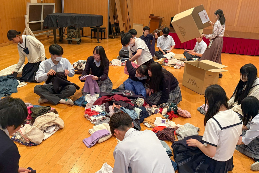 10月10日に2年生と3年生が仕分け・梱包作業を、11月13日に生徒会や有志の生徒らが最終の梱包・発送作業を実施した。これらの衣服はファーストリテイリングが実施する「服のチカラプロジェクト」を通じて、世界各地の難民キャンプへ届けられる予定。