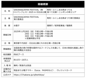 日本最大級の魚介グルメフェスティバル「SAKANA&JAPAN FESTIVAL(魚ジャパンフェス)2025 in日比谷公園」(主催:SAKANA&JAPANFESTIVAL実行委員会)が11月28日(金)から30日(日)までの3日間、東京・千代田区の日比谷公園で開催される。魚ジャパンフェスは四方を海に囲まれた日本の大切な食文化で栄養豊富な「魚食」の活性化を目的に開催される。