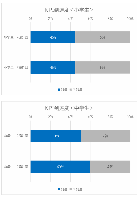 今回の検定におけるKPI到達度は小学生45.0%で、2024年第1回検定と同じ数値だった。一方、中学生は2024年第1回検定よりも9ポイントアップし60%となった。