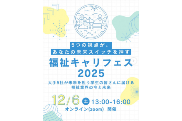 福祉業界大手の学研ココファン、SOMPOケア、ツクイ、ニチイホールディングス、ベネッセスタイルケア(※五十音順) の5社は、Zoomを利用した学生向け合同オンラインイベント「福祉キャリフェス2025」を12月6日に初開催する。参加無料。入退場自由で、気になるテーマのみの参加も可能。