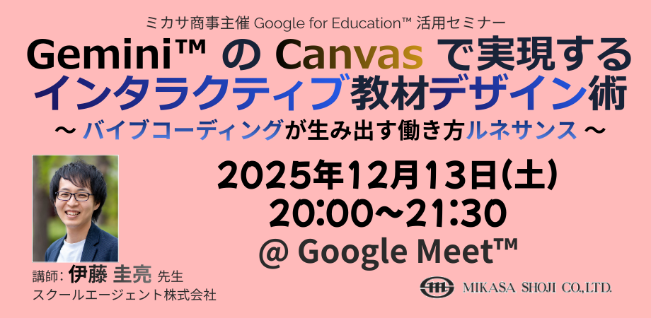 ミカサ商事は、教職員向けICT活用セミナー「GeminiのCanvasで実現するインタラクティブ教材デザイン術〜バイブコーディングが生み出す働き方ルネサンス〜」を、12月13日にオンラインで開催する。本セミナーは、同社が運営する教員向け Google for Education 活用コミュニティ「G-Apps.jp Community」が定期的に開催するイベントの一つ。誰でも無料で参加可能。