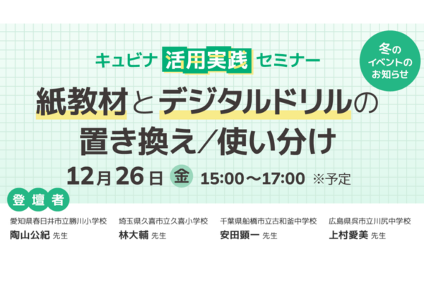 COMPASSは12月26日に、全国の自治体および学校関係者を対象に「紙教材とデジタルドリルの置き換え/使い分け事例」を共有するオンラインセミナーを開催する。同社が開発・提供する学習eポータル+AI型教材「キュビナ」を活用している小学校・中学校教員が登壇し実践発表が行われる。