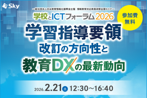 学習指導要領改訂の方向性や、校務用スマートフォンの活用をはじめとする教育DXの最新動向をテーマに、情報教育対応教員研修全国セミナー「学校とICTフォーラム2026」(主催:日本教育情報化振興会、協力:Sky)が2月21日に品川インターシティホールにて開催される。