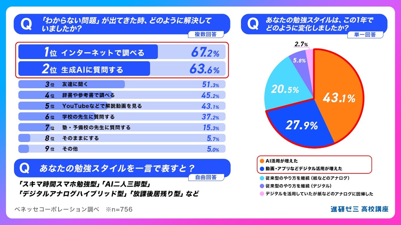 ベネッセコーポレーションが提供する通信教育講座「進研ゼミ 高校講座」は、全国の高校1年生~3年生756人に2025年の意識や学びの変化に関する調査を実施。12月9日、その調査結果を公表した。本調査では、高校生が2025年に何に関心を寄せ、デジタルやAIが学習へも取り入れられているなかで、学びがどのように変化しているのかを明らかにしている。