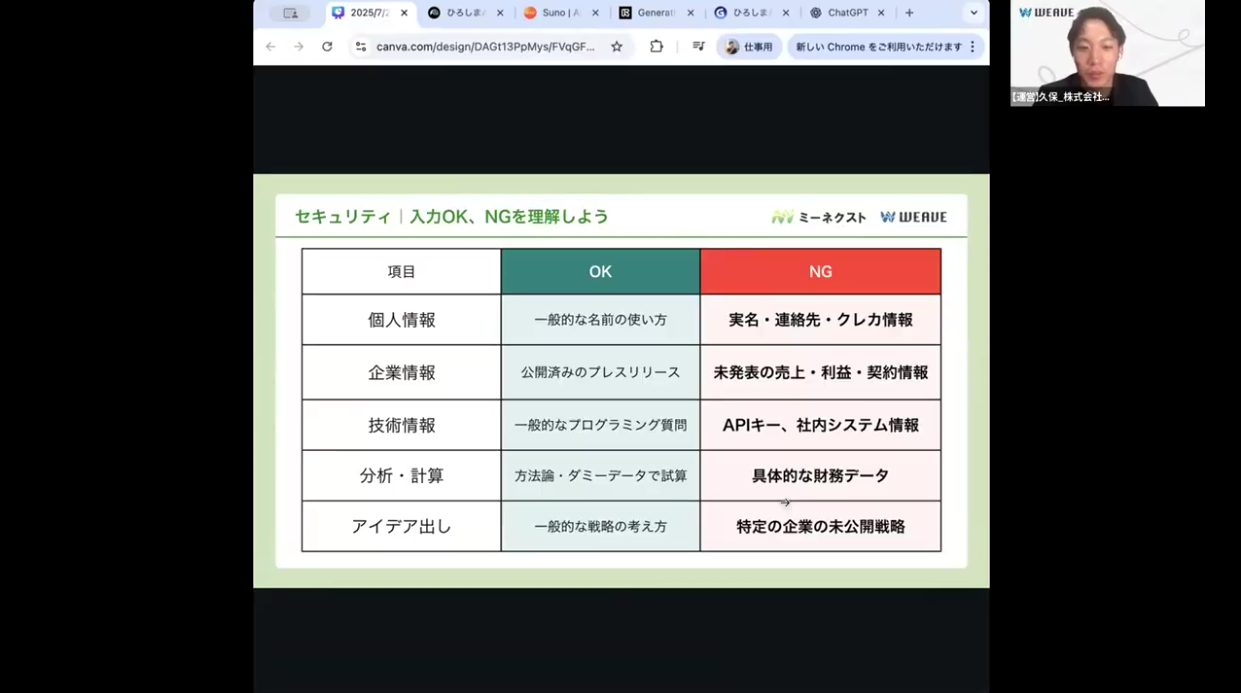 最後に実施したのは、生成AIを安全に活用するためのセキュリティ講座。入力してよい情報と避けるべき情報を具体例で紹介し、実名・連絡先・社内情報などの取り扱いに注意が必要であることを解説した。また、学校生活アンケートを題材にしたケーススタディでは、「個人名を削除し自由記述のみを入力する」という適切な方法を検討。参加者は実際に判断しながら「なるほど、こうすれば安心できる」と納得の表情が見られた。