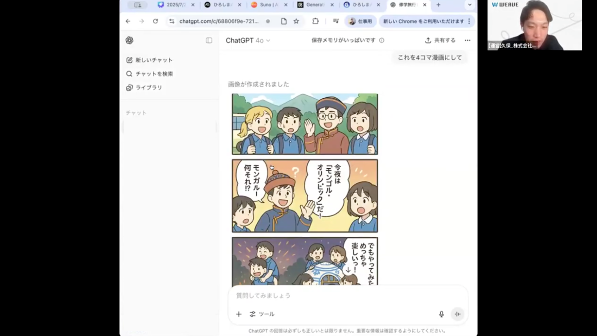 次のワークでは、テスト勉強や授業内容を題材に、ChatGPTに相談しながら4コマ漫画を作成した。高校生は歴史や社会などの学習内容を、教員は授業の解説を漫画に整理。AIを活用することで、知識をわかりやすく表現する新しい方法に挑戦した。