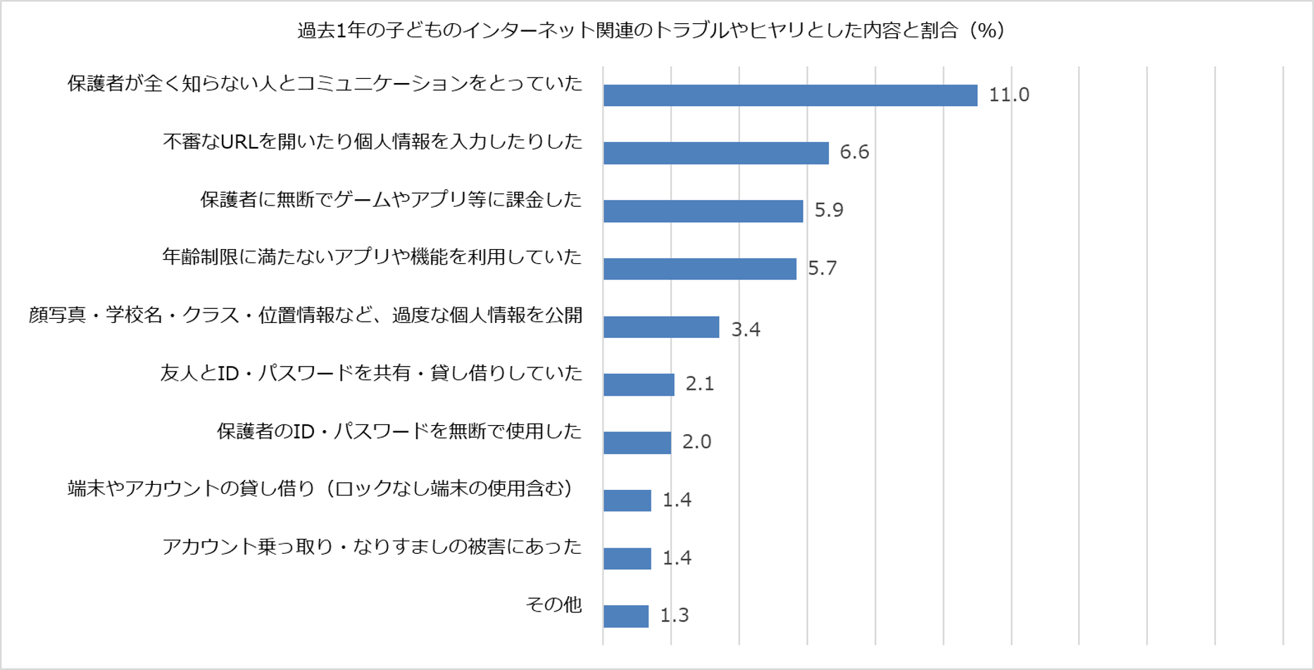 トラブルやヒヤリの内容として、「保護者が知らない人とコミュニケーションをとっていた」が11.0%、「不審なURLを開いたり個人情報を入力したりした」が6.6%、「保護者に無断でゲームやアプリ等に課金した」が5.9%、子供側が保護者の想定外の使い方をしてトラブルやヒヤリとしたケースが上位を占めている。