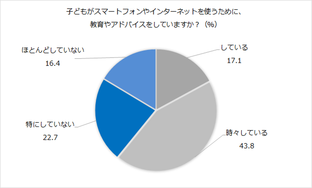 子供がスマートフォンやインターネットを使うための教育やアドバイスを「している」または「時々している」と回答した保護者は60.9%。一方、「特にしていない」または「ほとんどしていない」と回答した保護者も39.1%を占め、教育やアドバイスの取り組み状況には幅があることが確認された。