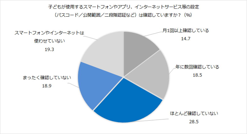 子供が使用するスマートフォンやアプリ、インターネットサービス等の設定(パスコード/公開範囲/二段階認証など)を「月1回以上」または「年に数回確認している」と回答した保護者は、33.2%にとどまる。その一方で、「まったく確認していない」または「ほとんど確認していない」と回答した保護者が47.4%と、SNSの公開範囲や、アプリ課金の設定が意図しない設定になっている可能性も高く、スマートフォンを操作する時間が増える休日や長期休みには特に注意が必要だ。