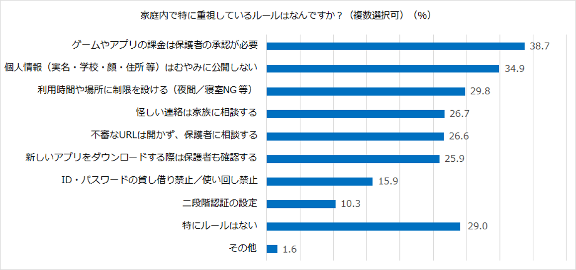 家庭内で重視されているルールとしては、利用時間や課金の制限、個人情報の扱いといった、保護者が管理しやすい項目が多く挙げられた。保護者の想定と子供の実際の使い方との間に大きなギャップがあり、見守りの難しさが浮き彫りとなった。