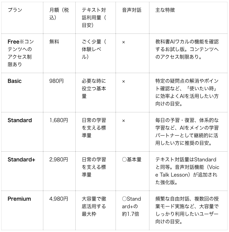 2025年12月現在は、同社が発行する2025年度版中学校英語教科書『NEW HORIZON』に対応しており、教科書に基づく練習問題や解説の生成、予習・復習サポート、発表や課題の準備など、学習者の学びを支援する。今後は同社発行の他の教科書にも順次対応を進めていく予定で、2026年春には2025年度版中学校数学教科書『新しい数学』に対応予定。