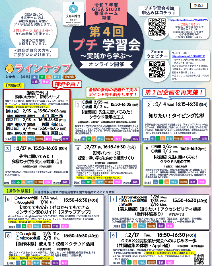 文部科学省「GIGA StuDX推進チーム」は、教職員や教育委員会職員を対象に、第4回プチ学習会を1月14日から開催する(〜3月4日まで)。