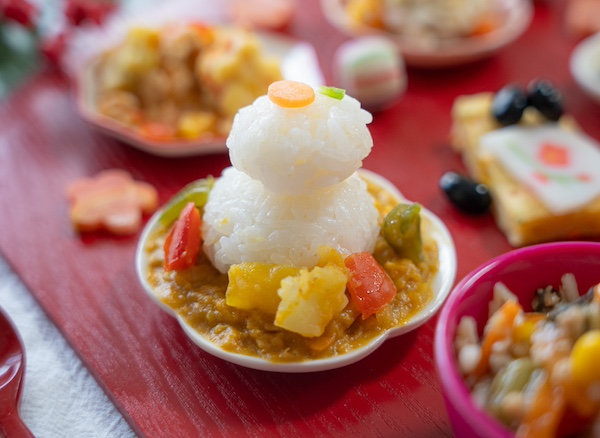 【所要時間】5分程度【作り方】ポークの彩りカレーを作り方の記載通りにレンジで加熱し、お皿に盛り付け。ごはんを鏡餅の形におにぎりにし、カレーの上に置きます。みかんは人参、葉っぱはさやいんげんで。ポイント:具材の野菜を表面に飾るとカラフル、華やかに。