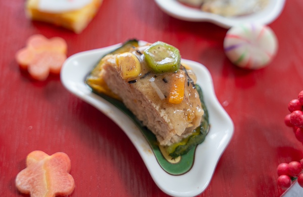【所要時間】4分程度【作り方】米粉のお食事パンケーキを作り方の記載通りにレンジで加熱し、かまぼこと黒豆をそえて、おせち風に飾り付けます。ポイント:他にもお子さまの好きな物を飾り付けしてお正月の思い出に。