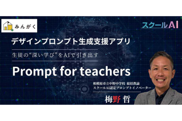 みんがくは12月24日、教員の授業デザインづくりを「伴走型」で支援するデザインプロンプト生成支援アプリ「Prompt for teachers」を、スクールAIのプラットフォーム上で提供開始した。本アプリは、相模原市立中野中学校 総括教諭・梅野哲が開発した。小学1年生〜高校3年生まで対応。月額500円で利用できる。