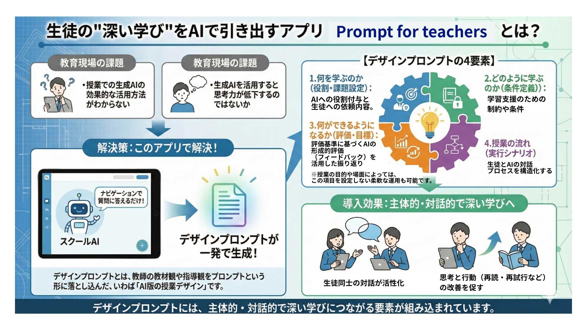 「Prompt for teachers」は、教員が授業デザインを考える際に行ってきた思考の整理・言語化・構造化を、スクールAIが伴走しながら代わりに担うアプリ。