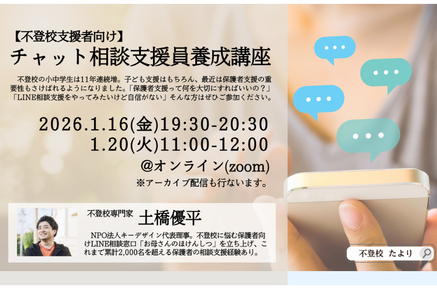 NPO法人キーデザインは、不登校支援者向け「チャット相談支援員養成講座」を、1月16日と1月20日にオンラインで開催する。
