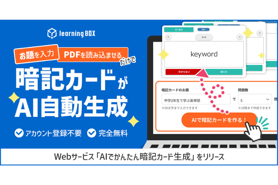 learningBOXはこのほど、登録不要・無料で使えるWebツール「AIでかんたん暗記カード生成」をリリースした。本サービスは、お題(キーワード)を入力するだけで、AIが「用語」と「解説」からなる暗記カードを自動生成できる。さらに、手元のPDF資料を読み込ませることで、その内容をもとに暗記カードを作成することも可能だ。カードはWeb上でそのまま閲覧・学習でき、URLで共有することも可能。