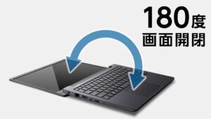 ディスプレイは最大180°まで開閉可能。設置環境や利用シーンに応じて柔軟に角度を調整することができ、対面での画面共有やプレゼンテーションなどで高い利便性を発揮する。加えて、500万画素のWindows Hello対応カメラを搭載し、オンライン授業やビデオ通話時に高精細でクリアな映像を提供する。顔認証に対応したWindows Helloにより、迅速かつセキュアなユーザー認証を実現し、パスワード入力を行わずにスムーズにログインできる。