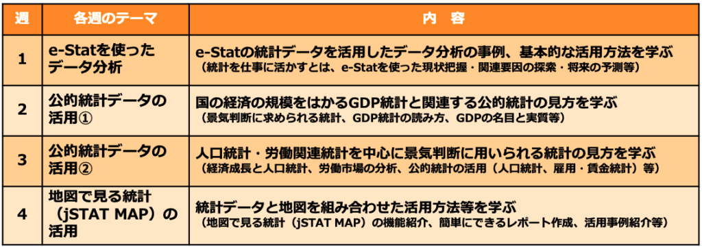 本講座は、社会人・大学生に統計オープンデータを活用したデータ分析の手法を分かりやすく解説する講座で、e-Stat(政府統計の総合窓口)やjSTAT MAP(地図で見る統計)を使ったデータ分析のほか、ふだんメディアなどで耳にするGDP統計(国民経済計算)を始めとした景気判断に用いられる統計を詳しく見ていくとともに、人口・雇用・賃金等に関する統計の見方も学ぶことができる内容となっている。登録料・受講料は無料で、専用サイトから誰でも受講可能。受講登録は2月23日まで。