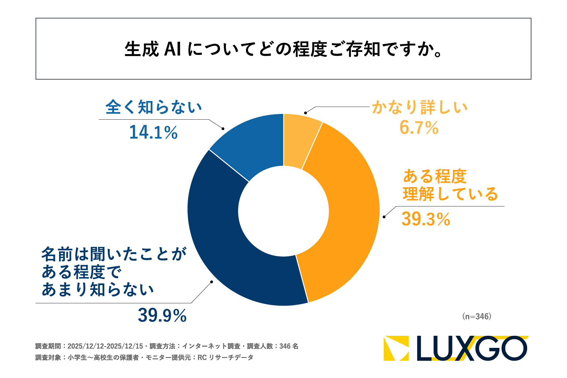 まず、「生成AIについてどの程度知っているか」を尋ねたところ、1位が「名前は聞いたことがある程度であまり知らない」で39.9%、2位が「ある程度理解している」で39.3%、3位が「全く知らない」で14.1%という結果だった。1位と3位の回答を合計すると回答率54.0%となり、この結果から、小学生~高校生の保護者の半数以上が、生成AIについて詳しく知らない、もしくは全く知らないことがわかった。