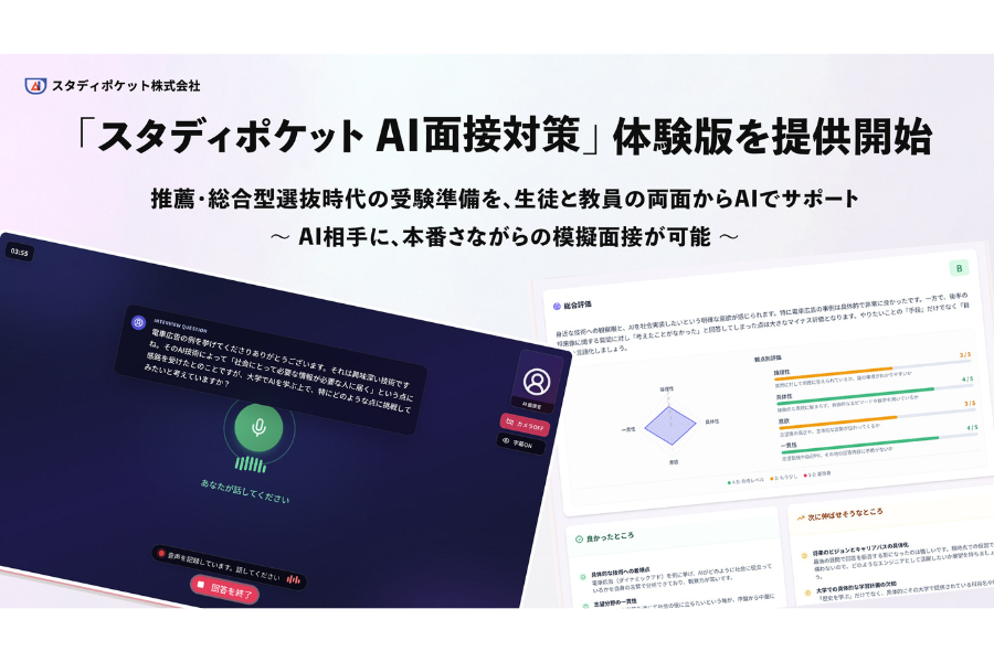 スタディポケットは、学校向け生成AIサービス「スタディポケット for STUDENT、for TEACHER」において、AIと音声・ビデオで対話しながら模擬面接ができる新機能「スタディポケット AI面接対策」の体験版を提供開始し、併せて特設サイトを公開した。