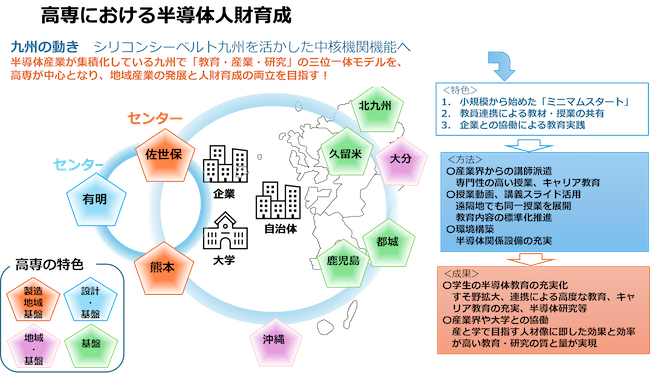 半導体産業が集積する九州では、全9校(有明高専、熊本高専、佐世保高専、北九州高専、大分高専、久留米高専、都城高専、鹿児島高専、沖縄高専)が連携。産業界、地域大学、自治体との協働により、▽企業講師による専門性の高い授業とキャリア教育▽授業動画、教材の高専間の共有による教育内容の標準化▽半導体関連設備の充実化による実践教育の強化――を実現し、「設計から製造まで」幅広い分野で活躍できる人財を育成している。
