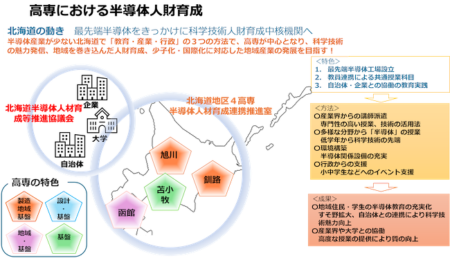 Rapidus株式会社の最先端半導体工場設立を契機に、旭川高専、釧路高専、苫小牧高専、函館高専が「北海道地区4高専半導体人材育成連携推進室」を設立。北海道半導体人材育成等推進協議会と連携し、▽低学年から最先端半導体技術に触れる多様な授業展開▽小中学生向けイベントを通じた科学技術の魅力発信▽自治体・企業と協働した地域全体の人財育成――を進めており、半導体産業のまだ少ない地域でも、全国トップレベルの教育環境の構築を目指している。