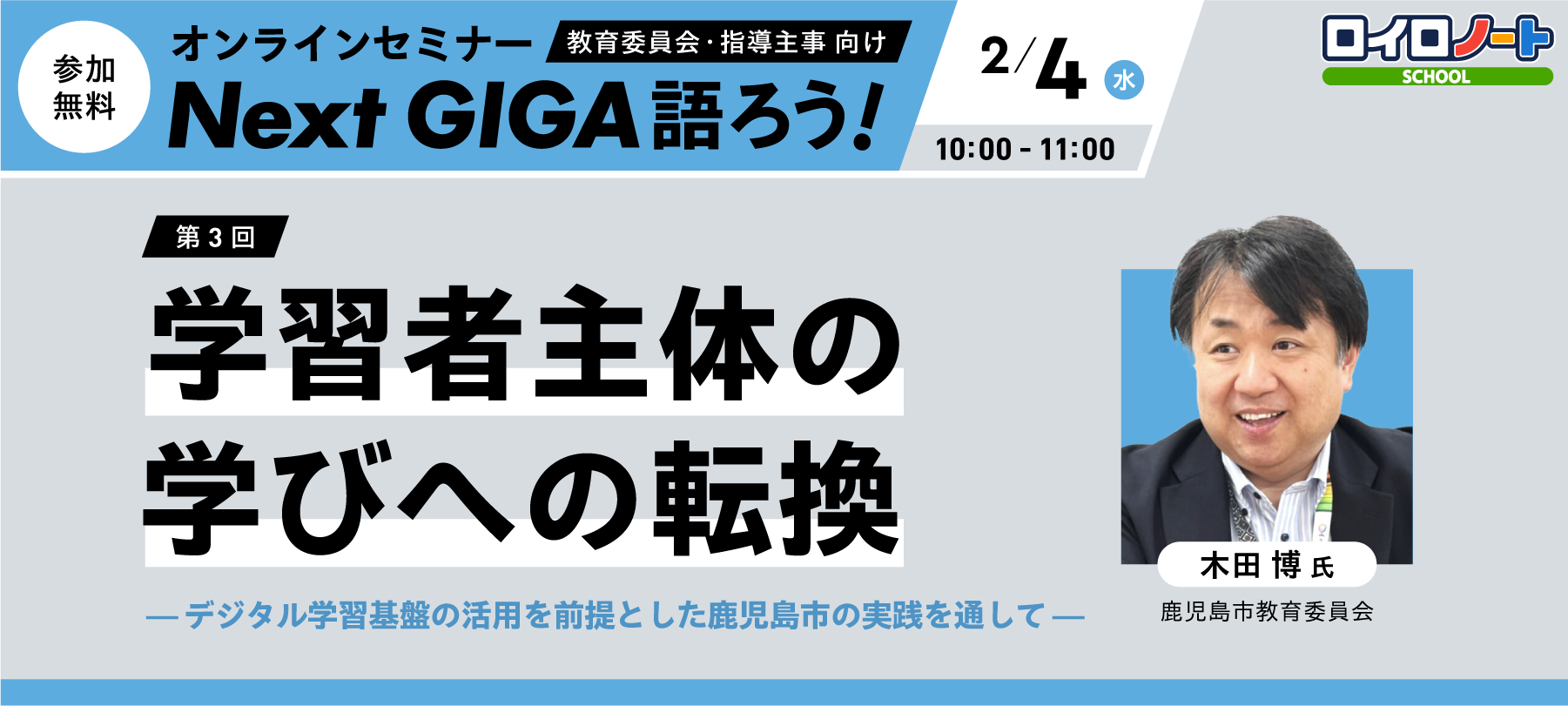 今回は、鹿児島市教育委員会 教育DX担当部長の木田博氏が登壇し、デジタル学習基盤を活用した「学習者主体の学びへの転換」について、理論と実践の両面から考える。参加無料。
