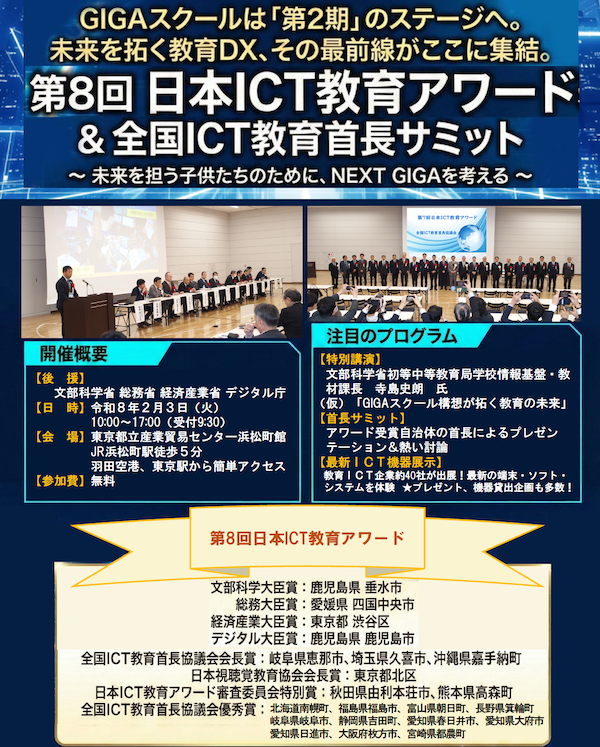 全国ICT教育首長協議会は2月3日に、東京・浜松町の東京都立産業貿易センター 浜松町館にて「全国ICT教育首長サミット」および「第8回日本ICT教育アワード」を開催する。参加無料。申込締切は1月29日。