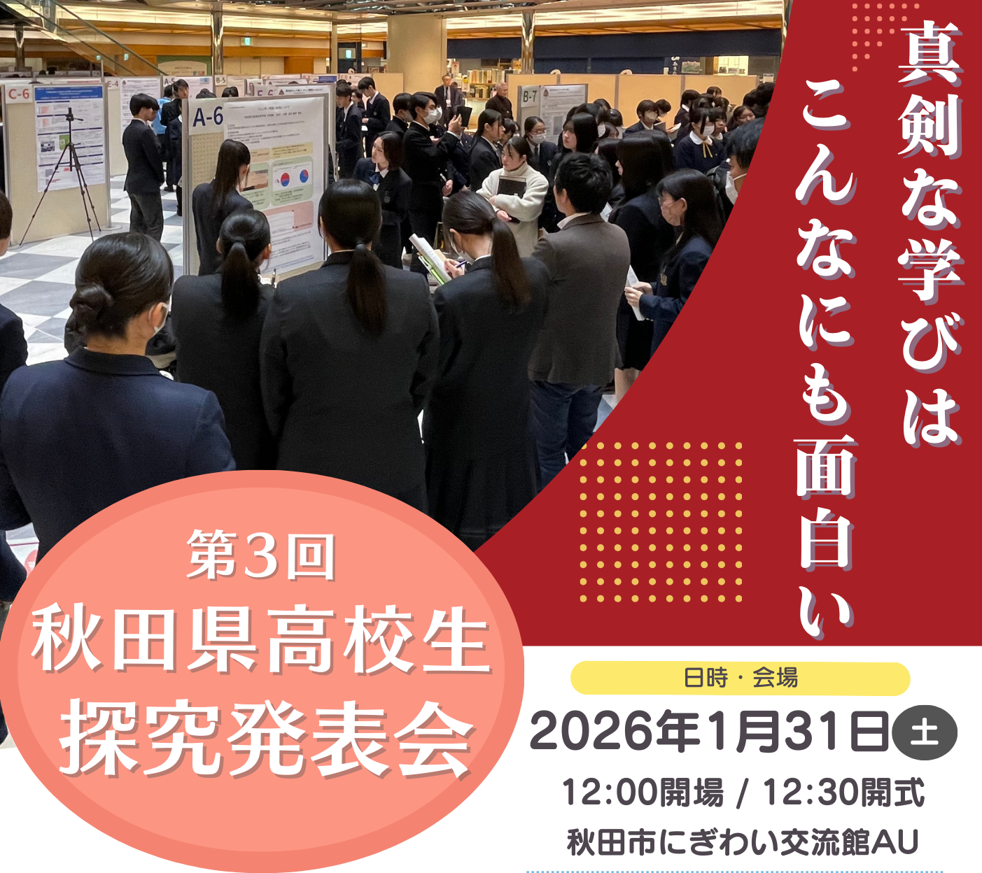 秋田県内の高校生が参加し、ポスター形式で探究成果の発表および質疑応答を行う。発表に対しては、秋田県内の博士教員を中心とした有識者によるフィードバックを実施し、生徒の今後の探究活動の深化を支援する。また、参加生徒・教員それぞれの交流会も予定している。