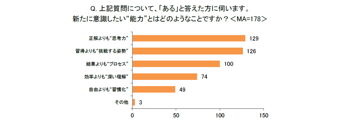 また、「ある」と回答した人に、新たに意識したい“能力”について質問をしたところ、「正解よりも“思考力”」「習得よりも“挑戦する姿勢”」「結果よりも“プロセス”」という回答が上位を占めたことから、知識量や結果そのものより、取り組む過程を重視する親が多いことが読み取れる結果となった。