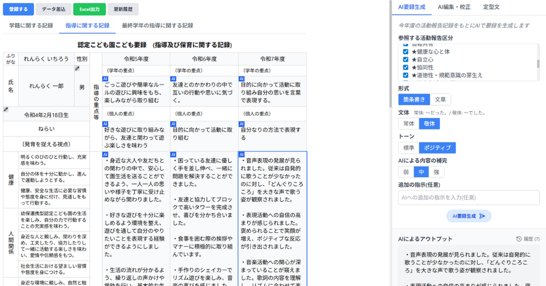 本機能は、園内で日々蓄積される子供の活動記録や育ちの記録をもとに、生成AIが指導要録の文章作成を補助するもの。現場で温かく見守られてきた日々の気づきを大切にしながら、職員の記入負担軽減と記録内容の充実を目的としている。