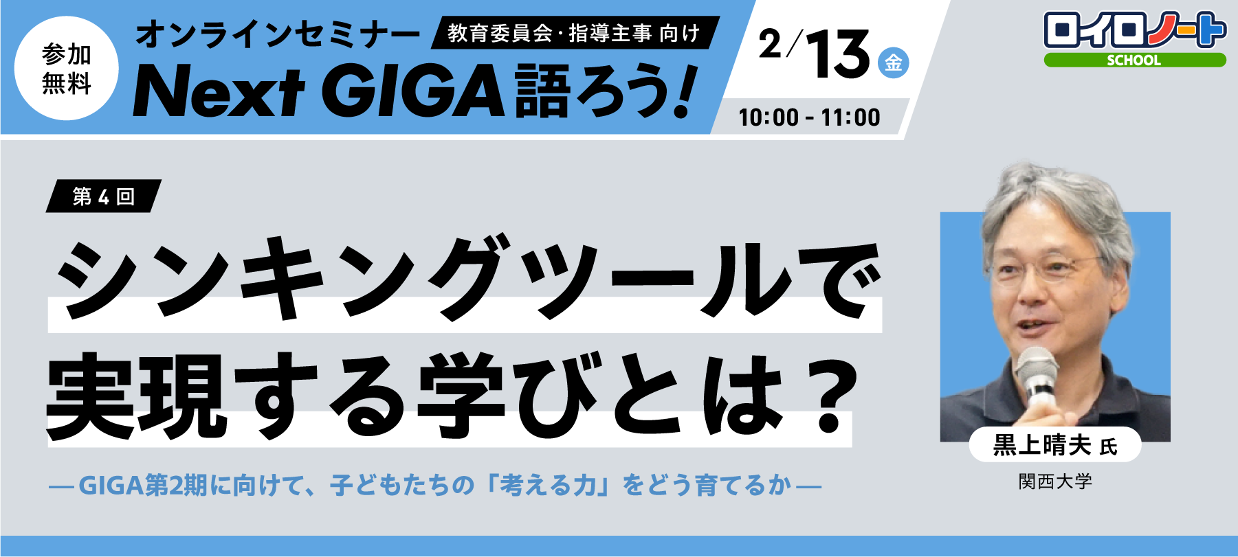 今回のテーマは「思考力の育成」。関西大学教授の黒上晴夫氏が登壇し、思考を促す「シンキングツール(思考ツール)」を切り口として、子供たちの思考力をどのように育てていくかを考える。参加無料。