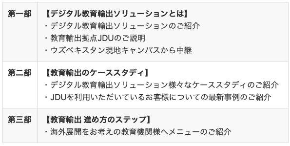 「他国での高度人材の育成」を目指しデジタル技術を活用した教育モデルを推進する取り組みについて、ウズベキスタンの現地キャンパスからの中継も交え、同社が展開する教育輸出ソリューションの概要とケーススタディ、最新事例、進め方のステップについて紹介する。