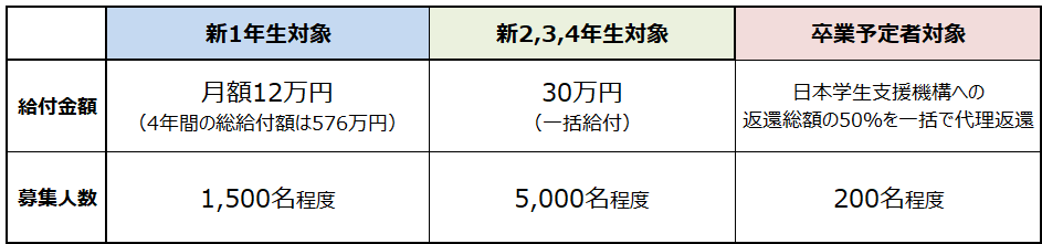 今年度から制度内容を拡充した。月額給付額を12万円に増額し、4年間で総額576万円を給付する。募集人数も1,500人に拡大している。 応募資格は、2026年4月に入学する大学新1年生(募集年度の4月1日現在20歳以下であること)、対象大学は日本国内の4年制大学で学部は文系・理系を問わない。