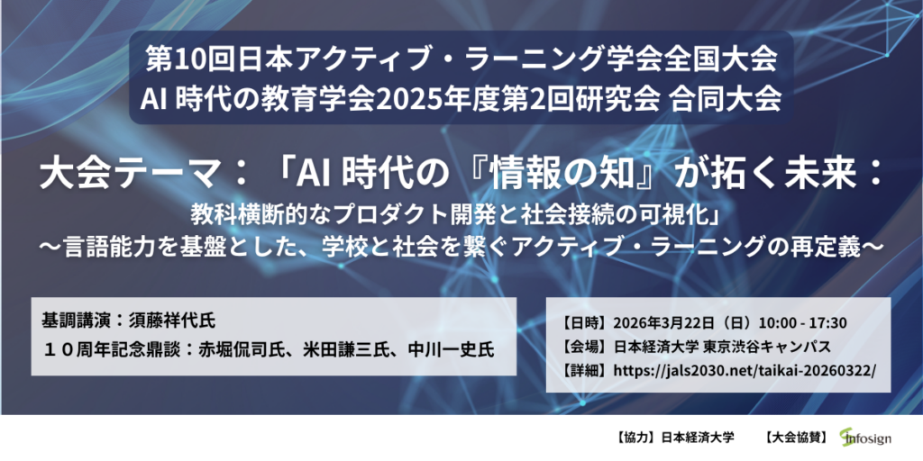 第10回日本アクティブ・ラーニング学会全国大会とAI時代の教育学会2025年度第2回研究会の合同大会が3月22日、日本経済大学 東京渋谷キャンパスで開催される。今回の大会テーマは「AI時代の『情報の知』が拓く未来:教科横断的なプロダクト開発と社会接続の可視化〜言語能力を基盤とした、学校と社会を繋ぐアクティブ・ラーニングの再定義〜」。基調講演やパネルディスカッション、研究実践発表などが予定されている。