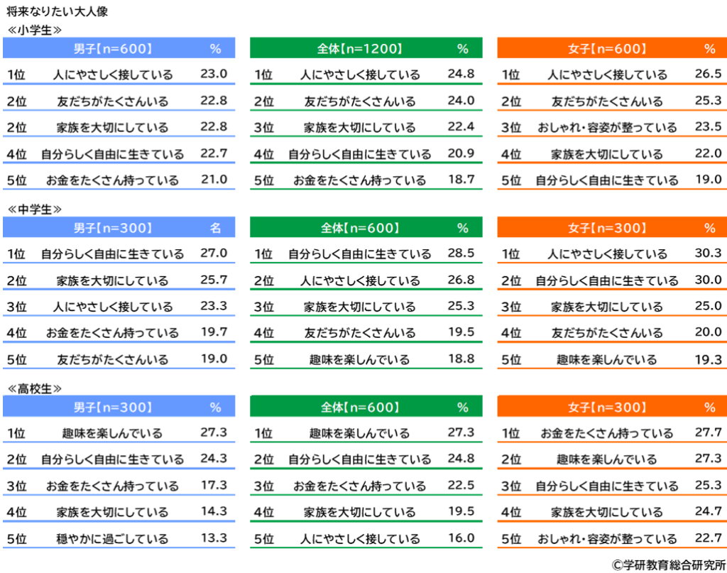 将来、どのような大人になりたいと思っているかをきいたところ、小学生では、1位は「人にやさしく接している」だった。次いで、2位「友だちがたくさんいる」、3位「家族を大切にしている」、4位「自分らしく自由に生きている」、5位「お金をたくさん持っている」となった。
