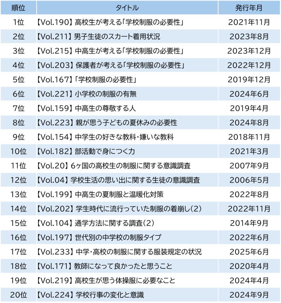 また、カンコーホームルームはこの2月でWeb創刊20周年。これを記念し、2025年1月1日~12月31日の期間に最も読まれたコラムの年間ランキング(トップ20)も併せて発表している。ランキングでは、制服の在り方そのものを問う根源的なテーマや、ジェンダーレス、校則のアップデートに対する高い関心が浮き彫りとなっている。
